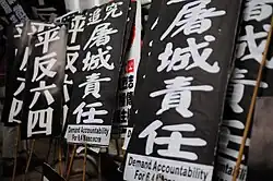 On June 4, 1989, after the Massacre took place, Hong Kong University students lay out a bridge-length black vertical protest banner and painted in white the phrase "Cold-Blooded Slaughters Will Not Kill Their Spirit; Vow to Revenge Democracy Never Dies"「冷血屠城烈士英魂不朽 誓殲豺狼民主星火不滅」to show support of democracy and to condemn the Chinese government.[7] Although the black vertical protest banner was only hung for one day, the white paint that leaked through the fabric and left on the bridge become a piece of historic artifact of the banner's existence. Thereafter, annually, Hong Kong University students would repaint these twenty words directly on the bridge concrete.[8] This is probably the first vertical pro-democracy protest banner in Hong Kong. As time passes, the June 4th commemoration vigil in Hong Kong would always be held at night in Victoria Park, since the massacre in 1989. The weekend before June 4, or if June 4 lands on a weekend, there would be a massive rally on the streets of Causeway Bay to demand accountability from the Chinese officials as authorities still denied to this date.[9][10] The vertical protest banner shown here was from the 2009–20th anniversary—march, on which "Dare Not Forget June Fourth" (「毋忘六四」) and "Remember June Fourth 20th Anniversary" (「紀念六四20週年」). In 2020, Hong Kong authorities for the first time denied the vigil citing pandemic health concerns, and later arrested many for unlawful gathering.[11][12]