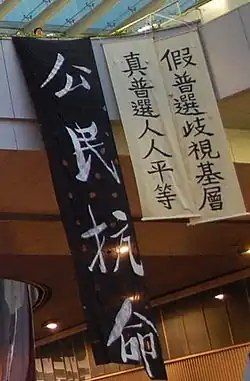 Over 13,000 college students gathered in Hong Kong Chinese University (CUHK) on the first day of the Hong Kong class boycott campaign to demand universal suffrage and democracy in response to Beijing's denial on August 31.[21] Other demands included increasing social inequality and increase government transparency and officials' accountability.[22][23] The strike was supported by academic professors for a better Hong Kong and would later turn into the 2014 Umbrella Movement as Hong Kong government continued to ignore their demands.[24] There were two black banners hung vertically in the main atrium of CUHK. They read "We Decide Our Fate Boycott Must Go On" (「抗命捉緊命運 罷課事在必行」).[25] The three vertical banners seen on protest ground of CUHK were considered a literary triplet and should be read together. The two black and one red banners written in white paint should be read from right to left: "Future Uncertainties Can Be Solved By Humanity-Focused Democracy" (「傳人本之道」「授民主基業」「解末來之惑」).[26]