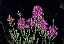 Verticordia drummondii, commonly known as Drummond's featherflower,[2] is a flowering plant in the myrtle family, Myrtaceae and is endemic to the south-west of Western Australia. It is an erect, openly to densely branched shrub with small, narrow leaves and pink to purple flowers in small heads near the ends of the branches.