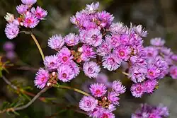 The flowers are arranged in rounded groups on stalks 2–15 mm (0.08–0.6 in) long near the ends of the branches. The floral cup is broadly top-shaped, about 1.5 mm (0.06 in) long, glabrous but slightly rough. The sepals are pink, sometimes white, 3–3.5 mm (0.12–0.14 in) long, with 5 to 7 hairy lobes. The petals are also pink or white, and are 2.5–3.0 mm (0.098–0.12 in) long, egg-shaped with long, coarse hairs. The style is 0.2–0.4 mm (0.008–0.02 in) long, straight and glabrous. Flowering time is from November to December or January.[3]