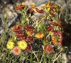 The flowers are arranged in corymb-like groups near the ends of the branches, each flower on a stalk 10–25 mm (0.4–1 in) long. The floral cup is about 3 mm (0.1 in) long with a slightly warty, glabrous surface. The sepals are yellow, turning red with age, 5–7 mm (0.2–0.3 in) long, spreading with 10 to 12 hairy lobes. The petals are a similar colour, spreading, 5–6 mm (0.20–0.24 in) long and have long, spreading, thin, finger-like projections. The style is 4–6 mm (0.16–0.24 in) long, straight and glabrous. Flowering time is from August to November.[2]