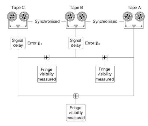 Each antenna will be a different distance from the radio source, and as with the short baseline radio interferometer the delays incurred by the extra distance to one antenna must be added artificially to the signals received at each of the other antennas. The approximate delay required can be calculated from the geometry of the problem. The tape playback is synchronized using the recorded signals from the atomic clocks as time references, as shown in the drawing on the right. If the position of the antennas is not known to sufficient accuracy or atmospheric effects are significant, fine adjustments to the delays must be made until interference fringes are detected. If the signal from antenna A is taken as the reference, inaccuracies in the delay will lead to errors and in the phases of the signals from tapes B and C respectively (see drawing on right). As a result of these errors the phase of the complex visibility cannot be measured with a very-long-baseline interferometer.