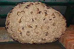Vespa tropica are raiders of the nests of other wasp species and take captured larvae back to their own nest to feed to their larvae. They have been observed to catch honeybees quite frequently, and even dragonflies have been noted as prey. A worker of V. tropica has been recorded as capturing and killing an individual of Vespa bicolor[1] and also raiding nests of other polister wasps such as Ropalidia marginata. Vespa tropica is associated with forests in the lowlands, up to 2,100 metres (6,890 ft) altitude.[9] The nests are usually within 3 metres (3 yd) above the ground in tree hollows or in subterranean cavities normally down to a depth of 20 centimetres (8 in) including a record of one found inside a dead log partly buried in the soil. In the vicinity of human habitations it will nest under roofs, in attics and sheds.[2][9] The nest is normally rhomboid or bowl-shaped and has an open bottom, whereas most aerial hornets' nest are completely sealed. The outer shell of the nest consists of distinct, broad layers and the nest is quite brittle. Occasionally nests are built within the crown of trees.[1] Nest temperature is maintained at 25–30 °C (77–86 °F) until about the middle of October, when it trends towards ambient[Martin-1990 1]