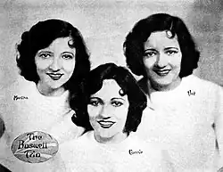 The Boswell Sisters were an American close harmony singing trio of the jazz and swing eras, consisting of three sisters: Martha Boswell (June 9, 1905 – July 2, 1958), Connie Boswell (later spelled "Connee", December 3, 1907 – October 11, 1976), and Helvetia "Vet" Boswell (May 20, 1911 – November 12, 1988). Hailing from uptown New Orleans, the group blended intricate harmonies and song arrangements featuring effects such as scat, instrumental imitation, ‘Boswellese’ gibberish, tempo and meter changes, major/minor juxtaposition, key changes, and incorporation of sections from other songs.[1] They attained national prominence in the United States in the 1930s during the twilight of the Jazz Age and the onset of the Great Depression.[2]