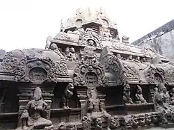 Historians have equated the temple with similar temples across India based on the monolithic classification and being carved in-situ out of a pre-existing rock. Historian K. V. Soundara Rajan believes that the temple is similar in architecture to that of Virupaksha Temple at Pattadakal in Karnataka by Vikramaditya II during 734–44 CE, Kanchi Kailasanathar Temple built by Narasimhavarman II during 685–705 CE and Kailasa temple, Ellora by Krishna I during 756–77 CE.[7] Some historians suggest that the similarities in the architecture are indicative of the political relations between the Pallavas, Rashtrakutas and Chalukyas. This view has been disputed by other historians.[8]