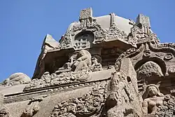 The temple is carved out from a single rock in a rectangular portion measuring 7.5 m (25 ft) in depth. The carvings in the temple show the top portion of the temple, with an unfinished bottom. The sculptures and the carvings are indicative of Pandyan art during the period.[3] The granite rock looks like a blooming lotus, with hills surrounding it on three sides. The vimana (ceiling over the sanctum) has niches of Parsavadevatas, the attendant deities of Shiva, like ganas, Dakshinamurthy depicted playing a mridanga, Siva with his consort Uma, dancers, various niches of Nandi (the sacred bull of Shiva) and animals like monkeys and lions. Historian Sivaramamurti states that this is the only site where Dakshinamurthy is depicted playing the Mridanga (a percussion instrument), while in all other places, he is depicted playing Veena. According to epigrapher V. Vedachalam, there is a spontaneity in the sculptures indicating of natural human movements like in the Shiva and Uma sculpture where they seem to be talking like common folks.[4] The Vettuvan Koil is an unfinished Shiva temple.