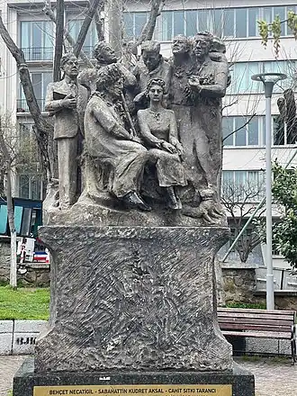 A part of Beşiktaş Vişnezade Park is oriented under the name "Şairler Sofası". Şairler Sofası is the 1998 sculpture by Gürdal Duyar whose name the park goes by. The depicted characters in the sculpture as well as the figures depicted in the other sculptures in the greater park are 19th and 20th century poets who have mostly lived in and around Beşiktaş. [1] In the sculpture Şairler Sofası, Duyar has composed it such that the poets are "hand in hand" and "shoulder to shoulder". It includes the poets Behçet Necatigil, Sabahattin Kudret Aksal, Cahit Sıtkı Tarancı, Oktay Rıfat, Orhan Veli, Neyzen Tevfik and Nigâr Hanım together in one composition. [2] The Architectural design of the park was done by Erhan İşözen.[2] The park was opened in 1998 together with the first sculptures. at the inauguration of the park the mayor of Beşiktaş, Ayfer Atay, said that the park will be a place where books will be signed and poems will be read.[3] The park has become a place where more poets and other members of Turkish society were honored with monuments over the years.
