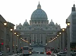 Despite being one of the few major thoroughfares in Rome able to cope with a high volume of traffic without congestion,[3] it is the subject of much ire both within the Roman community and among historical scholars due to the circumstances under which it was constructed.[4][5] The area around the church was rebuilt several times following the various Sacks of Rome, and again after having deteriorated due to the loss of prosperity resulting from the Papacy's relocation to Avignon during the 14th century. Through all of these reconstructions, the area in front of the short courtyard of Saint Peter's Basilica remained a maze of densely packed structures overhanging narrow side-streets and alleyways.