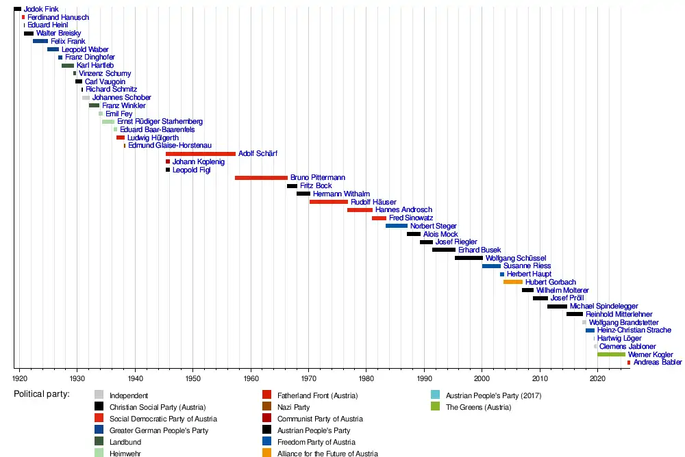 Andreas BablerWerner KoglerClemens JablonerHartwig LögerHeinz-Christian StracheWolfgang BrandstetterReinhold MitterlehnerMichael SpindeleggerJosef PröllWilhelm MoltererHubert GorbachHerbert HauptSusanne RiessWolfgang SchüsselErhard BusekJosef RieglerAlois MockNorbert StegerFred SinowatzHannes AndroschFritz BockBruno PittermannLeopold FiglJohann KoplenigAdolf SchärfEdmund Glaise-HorstenauLudwig HülgerthEduard Baar-BaarenfelsErnst Rüdiger StarhembergEmil FeyJohannes SchoberRichard SchmitzCarl VaugoinFranz DinghoferLeopold WaberFelix FrankWalter BreiskyEduard HeinlFerdinand HanuschJodok Fink