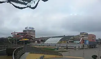 The park was developed by the Rubicon Group (now ICOR) at a cost of 72 million litas (equivalent to about €20.85 million at the time).[1] Construction of Vichy was overseen by the Lithuanian architects UAB Tiksli Forma with the waterslides designed and manufactured by Dutch company Van Egdom. Swiss company International Waterpark Management developed the conceptional design, and Spanish company Amusement Logic S.L. developed the park's Polynesian theme in consultation with the Polynesian Cultural Center in Hawaiʻi.[1][2] To help evoke a tropical atmosphere, Vichy injects a fig oil-based scent throughout the park.[3]