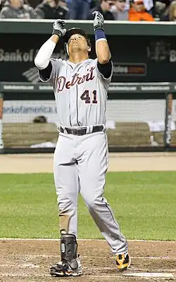 On November 23, 2010, Martínez and the Detroit Tigers organization reached an agreement on a four-year, $50 million free agent contract.[27] On March 31, 2011, Martínez made his debut for the Tigers as a designated hitter against the New York Yankees, going 1-for-4 in the 6–3 loss.[28] Martínez was used almost exclusively as a designated hitter for the 2011 season, playing only 26 games at catcher and six games at first base.[6] He had a slow start to the season, batting .250 in the month of April with two home runs, but he then batted .337 in May and .370 in June. On September 11, in a game at home against the Minnesota Twins, he had perhaps his worst-ever game at the plate, going 0-for-4 and hitting into four double plays (three of them GIDPs, one a line drive); his team managed to win anyway, 2–1.[29][30] It was the first time a batter had hit into four double plays in the American League since Hall of Famer Goose Goslin did so in 1934, also while playing for the Tigers, and also in a game the Tigers won, 4–1.[29][31] Although his power numbers were down, with only 12 home runs all season, Martínez posted his best career batting average (.330, good for fourth-best in the American League), tied his career high with 40 doubles, and had his fourth career 100+ RBI season (103, tied for 10th in the AL).[6][32] He also led the Major Leagues in batting average with runners in scoring position, hitting .394. In the 2011 postseason, Martínez batted .250 with two home runs, a triple, 5 RBI and five walks in 11 games, helping the Tigers to the ALCS.[33] The Tigers would lose the series to the Texas Rangers in six games.[34]