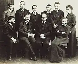 (from left to right): Paul Ehrenfest, Abram Ioffe, Dmitry Rozhdestvensky, Tatyana Afanasyeva. Standing (from left to right): Vladimir Chulanovsky, G. Weichardt, L. Isakov, G. Perlitz, Victor Robertovich Bursian, J. Schmidt