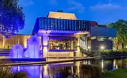 The Christchurch Town Hall was built on the northern side of the square between Kilmore Street and the Avon River / Ōtākaro. Designed by architects Warren and Mahoney in the brutalist style, it opened in 1972. Despite sustaining significant damage in the 2011 Christchurch earthquake, it was restored and reopened in 2019. It is listed as a category-I historic place by Heritage New Zealand.[92]