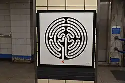 The station features several pieces of artwork. On the station concourse, there is a Labyrinth designed by Mark Wallinger, as part of the celebrations of 150 years of London Underground. As with all Victoria line stations, a tiled mural is located in the seat niches on the platforms – at Victoria, a silhouette of Queen Victoria was designed by Edward Bawden.[46]