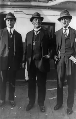 Huerta traveled from New York by train to Newman, New Mexico (25 miles (40 km) from the border), where he was to be met by General Pascual Orozco and some well-armed Mexican supporters. However, a US Army colonel with 25 soldiers and two deputy US marshals intervened and arrested him as he left the train, on a charge of sedition.[72] The German-initiated plan for Huerta to regain the Mexican presidency through a coup d'état was foiled. After some time in a US Army prison at Fort Bliss he was released on bail, but remained under house arrest due to risk of flight to Mexico. A day after, he attended a dinner at Fort Bliss. Later he was returned to jail, and while so confined died, perhaps of cirrhosis of the liver or possibly of cancer.[73] While the main symptom was yellow jaundice, poisoning by the US was widely suspected.[74] In The Dark Invader (published 1933), Captain von Rintelen wrote that he had heard that Huerta was poisoned by his cook; but that he had never found out the truth. [75]