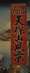The prints depict a scene of crowds visiting Tempōzan Park in Naniwa, the former name for present-day Osaka. Tempōzan—literally Tempō (era) mountain—was an approximately 20-meter high man-made hill created in 1831 (year 2 of the Tempō era) through the dredging of the adjacent Ajigawa River.[20] It was intended to improve ship access to the port and help prevent flooding. The mound also served as a marker for ships, earning it the nickname "Landmark Mountain" mejirushi yama (目印山) among local sailors.[21]