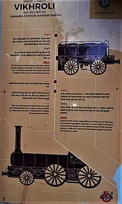 In 1942, The Godrej family brought plots in Vikhroli. Sir Phirojsha Godrej brought entire village in order to set up industrial township. The station was built to serve the Godrej Industries Complex which houses several Godrej factories and IT companies like Accenture, Atos, Capgemini, WNS etc. The old Godrej railway siding were crucial links that helped in setting up democracy in India by helping to conduct first general election.