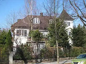 The Villenkolonie Pasing I was built on the initiative of the architect August Exter, starting in 1892, as "Villenkolonie Neu-Pasing I". Exter acquired a large piece of arable land and connected the area, at his own expense, with its own canal system and water through a water tower on Orthstraße. This settlement with numerous historically protected buildings followed the idea of the Garden city movement. The project was very successful, and nearly all of the 120 sites were sold in 1895.[1] The building styles were based on historical models and, on the other hand, local building traditions. The Villenkolonie is bounded to the south by the railways, in the west and north by the Nymphenburger Kanal and in the east by the Offenbachstraße. In 1897, west of the Pippinger Straße, the Villenkolonie Pasing II was established. In 1973 the ensemble of Villenkolonie Pasing I was protected as historical monument.