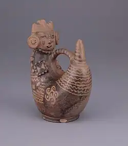 The Virú culture (alternatively known as the Gallinazo) was a pre-Columbian, pre-Inca culture that flourished in the Virú Valley on the northwest coast of Peru. It marks the start of the Early Intermediate Period of Peru, dating roughly around 200 BCE. This North Coast culture was based in the Virú Valley and extended into the Moche and Santa Valleys as well. The Virú Valley is on a coastal landscape which consists of a narrow land strip boarded by the Andes Mountains to its east and the Pacific Ocean to the west. The capital of the Virú valley during this time period was an urban area called the Gallinazo Group site.