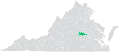 The district overlaps with Virginia's 1st, 4th, and 5th congressional districts, and with the 27th, 65th, 66th, 68th, 69th, and 71st districts of the Virginia House of Delegates.[4]