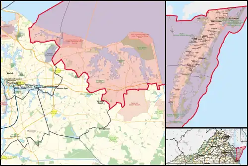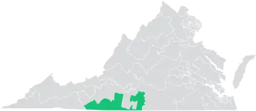 The district overlaps with Virginia's 5th and 9th congressional districts, and with the 5th, 6th, 9th, 14th, 16th, and 60th districts of the Virginia House of Delegates.[4] It borders the state of North Carolina.[1]