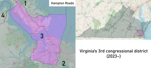 The Virginia Legislature's 2012 redistricting was found unconstitutional, in part because of racial gerrymandering, and replaced was with a court-ordered map on January 16, 2016 for the 2016 elections.[11][12][13][14][15][16][17] From 1993 to 2016, the 3rd had covered most of the majority-black precincts in and around Hampton Roads and Richmond. The court-drawn map shifted the area near Richmond to the 4th district.