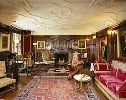 The rear hall again uses old oak high paneling and has small six by nine-inch oil portraits of Renaissance figures. Freestanding Corinthian columns in the hallway form an ornamental gateway and stained glass doors at the end enter the rear porch arcade. The dining room was furnished with oak bought later from Redbourn Manor in Hertfordshire and has an imposing Portland stone fireplace positioned midway in the room.[4] The floor is made of old re-sawn pegged oak and the Tudor rose ceiling motif is repeated.[4] In the southeast wing of the house is the Sulgrave Room, a reproduction of the great hall from the Washington family's Sulgrave Manor. The fireplace mantel is made of an oak beam, once used at the original priory.[4] Heavy oak timbers were used to construct the open beam ceiling in this room, which also features mottled plaster walls.[4]