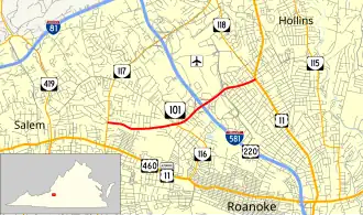 SR 101 begins at an intersection with SR 117 (Peters Creek Road) in the northwestern part of the city of Roanoke. The state highway heads east as a two-lane undivided road between the Westview Terrace and Washington Heights neighborhoods. SR 101 expands to a six-lane divided highway just west of its intersection with Cove Road, which heads south as SR 116. The state highway curves northeast through a commercial area where it has a cloverleaf interchange with I-581 and US 220. SR 101 passes along the southern edge of the Roanoke Regional Airport property and has a partial cloverleaf interchange with the intersecting boulevard, which heads south as Valley View Boulevard toward the Valley View Mall and north as Aviation Drive to provide access to the airport. The interchange includes a flyover ramp from eastbound SR 101 to northbound Aviation Drive. The state highway continues east through another commercial area to its eastern terminus at US 11 (Williamson Road). Hershberger Road continues east as a two-lane undivided city street to the eastern city limits of Roanoke, where it continues into Roanoke County as SR 625 to SR 115 (Plantation Road).[1][2]