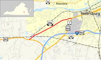 State Route 226 (SR 226) is a primary state highway in the U.S. state of Virginia. Known as Cox Road, the state highway runs 3.38 miles (5.44 km) from U.S. Route 460 (US 460) near Sutherland east to US 1 and US 460 Business near Petersburg. SR 226 is the old alignment of US 460 in northeastern Dinwiddie County.
