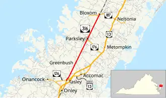 State Route 316 (SR 316) is a primary state highway in the U.S. state of Virginia. The state highway runs 9.49 miles (15.27 km) from U.S. Route 13 Business (US 13 Business) at Tasley north to SR 187 in Bloxom. SR 316 parallels an inactive railroad line as it connects the central Accomack County towns of Accomac, Onley, and Onancock with the northern county towns of Parksley, Bloxom, and Hallwood.