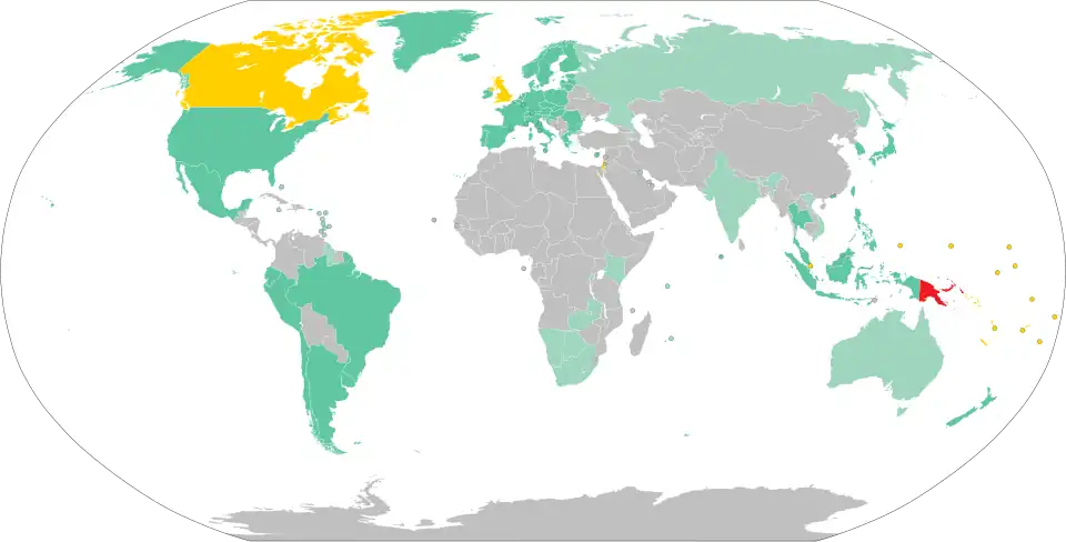 Citizens of the following countries and regions may obtain a visa on arrival valid for 60 days (unless otherwise noted) at Port Moresby International Airport.[1][2][3]