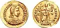 Various solidi in the name of Libius Severus (461-5) exist (Cohen VIII, 227.8). The most common type is the same as that of the solidi of Valentinian III, with the emperor standing on a human-headed snake.[11]