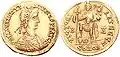 Issues of Liuvigild with a facing bust on both the obverse and the reverse are known. According to Grierson, this new type, characteristic of Visigothic coinage, was started between 579 and 586, in the last years of Liuvigild's reign, when his brother Liuva I, who had earlier reigned with him, had already died.[14] Grierson further argues that the introduction of the royal coinage, featuring the names of the Visigothic kings in the place of those of the Byzantine Emperors, was connected with the eldest son of Liuvigild, Saint Hermenegild, who was named co-regnant in 573, and married his wife Ingund in 579. His wife was a Frankish princess, and therefore was not an Arian but rather a Chalcedonian Christian. Following his marriage, Hermenegild abandoned Arianism, rebelling against his father and assuming the title of king, in a widespread revolt which was only subdued in 584. Hermenegild died in the following year, and his death allowed his brother Reccared I to become king. The struggle between Liuvigild and Hermenegild is thought to have resulted in the striking of coinage bearing the names of the two claimants to the crown.[14]