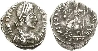 From c. 450 the Visigoths produced imitations of the coins of Valentinian III (425-455). One type of solidus and two types of tremissis were issued under his name. The solidus is catalogued as MEC 167-9, and copies a coin of the same value, Cohen VIII 212, 19. The obverse shows a portrait of the emperor facing right, with diadem, mantle and armour. On the reverse the emperor stands with a foot on a serpent with a human head. In his right hand he holds a cross, and in his left a globe supporting a Victory.[8][9]