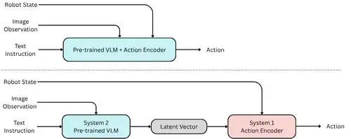 Comparison between single and dual-system architecture in a vision-language-action model. Single system VLA (top) is an end-to-end architecture that couples a pre-trained VLM with an action decoder. This model handles text, images, and robot state and output actions. Dual-system VLA (bottom) is a modular architecture in which the pre-trained VLM and the action decoder are two separate subsystems. They communicate through a shared latent space. Note that each system can run independently, even on different GPUs.