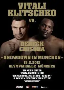 Vitali Klitschko vs. Derek Chisora, billed as Showdown in Munich, was a professional boxing match that was contested between WBC heavyweight champion, Vitali Klitschko, and the WBC's number 15 ranked contender, Derek Chisora. The bout took place on 18 February 2012 at the Olympiahalle, with Klitschko winning by unanimous decision.