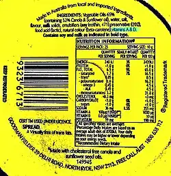 In light of the increase of vitamin D deficiency throughout Australia the federal government introduced mandatory fortification of vitamins and minerals such as vitamin D in certain foods like edible oil spreads as indicated in the: Australian Standard 2.4.2.[13] It is mandatory for all food manufacturing companies producing table spreads like spreadable butter and margarine to have no less than 55 mg/kg of vitamin D, as a response to a growing public health requirements.[13]