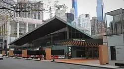 The exterior of the library–theater building contains a heavy roof that protrudes over the main facade, which is covered in travertine.[10][19] The roof was designed to screen the library and its performing-arts museum behind it. The top of the roof originally had an exposed-aggregate finish, but this was subsequently covered with stone pavement. On the underside of the roof are coffers containing recessed downlights as well as fluorescent uplights. Similar lighting fixtures are used in the theater's lobby as well as throughout the library's interior.[19] The roof is carried by two Vierendeel trusses measuring 20 ft (6.1 m) high and 153 ft (47 m) long.[8][19][18][b] Part of the library, housing the Vincent Astor Gallery,[20] is placed between the trusses.[21][16]