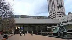 SOM and Saarinen collaborated on the design of the exteriors.[4] The main facade, along Lincoln Center's plaza, is two stories high and made of glass and steel.[15] The facade consists of a glass curtain wall and two recessed square concrete columns, which create a peristyle flanking the curtain wall.[18][19] Unlike the travertine surface of the plaza, the columns are finished in exposed aggregate.[18] The columns are attached to the attic via steel pins with large bronze pyramidal covers. The other wall surfaces are clad in travertine.[10][18][19]