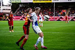 39 different clubs made inquiries about signing Miedema, before she signed a three-year contract with Bayern Munich in the top German league, the Frauen-Bundesliga, in June 2014.[17] During the 2014–15 season, she was part of a Bayern team that remained unbeaten in the Bundesliga and won the title for the first time since 1976.[18][19] Miedema scored her first league goals in Germany on 5 October 2014 in a match against MSV Duisburg, leading to Bayern's 6–0 win.[20] In the match against SGS Essen on 30 November, Miedema tore the outer band of her ankle resulting in some time away from the pitch. She re-emerged in the German league on 22 February 2015 against VfL Wolfsburg, scoring again in the following match, against Bayer Leverkusen.[13][21] Miedema finished the season with 7 goals in 17 matches.[13] She helped Bayern Munich defend the title the following season with 14 goals in 22 matches.[13]