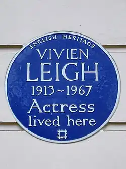 In 1969, a plaque to Leigh was placed in the Actors' Church, St Paul's, Covent Garden, London. In 1985, a portrait of her was included in a series of United Kingdom postage stamps, along with Alfred Hitchcock, Charlie Chaplin, Peter Sellers and David Niven to commemorate "British Film Year".[139] In April 1996, she appeared in the Centenary of Cinema stamp issue (with Sir Laurence Olivier) and in April 2013 was again included in another series, this time celebrating the 100th anniversary of her birth.[140] The British Library in London purchased the papers of Olivier from his estate in 1999. Known as The Laurence Olivier Archive, the collection includes many of Leigh's personal papers, including numerous letters she wrote to Olivier. The papers of Leigh, including letters, photographs, contracts and diaries, were owned by her daughter, Suzanne Farrington. (Farrington died in 2015.) In 1994, the National Library of Australia purchased a photograph album, monogrammed "L & V O" and believed to have belonged to the Oliviers, containing 573 photographs of the couple during their 1948 tour of Australia. It is now held as part of the record of the history of the performing arts in Australia.[141] In 2013, an archive of Leigh's letters, diaries, photographs, annotated film and theatre scripts and her numerous awards was acquired by the Victoria and Albert Museum in London.[142] Also in 2013, Leigh was among the ten people selected by the Royal Mail for their "Great Britons" commemorative postage stamp issue.[143]