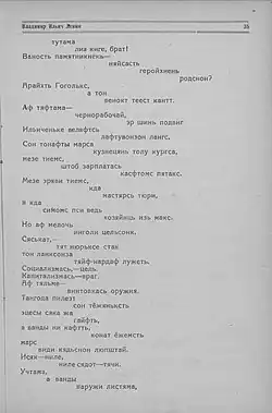 Mayakovsky's early poems established him as one of the more original poets to come out of the Russian Futurism, a movement rejecting the traditional poetry in favour of formal experimentation, and welcoming the social change promised by modern technology. His 1913 verses, surreal, seemingly disjointed and nonsensical, relying on forceful rhythms and exaggerated imagery with the words split into pieces and staggered across the page, peppered with street language, were considered unpoetic in literary circles at the time.[12] While the confrontational aesthetics of his fellow Futurist group members' poetry were mostly confined to formal experiments, Mayakovsky's idea was creating the new, "democratic language of the streets".[15]