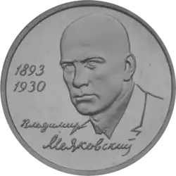 Among the Soviet authors he influenced were Valentin Kataev, Andrey Voznesensky (who called Mayakovsky a teacher and favorite poet and dedicated a poem to him entitled Mayakovsky in Paris)[46][47] and Yevgeny Yevtushenko.[48] In 1967 the Taganka Theater staged the poetical performance Listen Here! (Послушайте!), based on Mayakovsky's works with the leading role given to Vladimir Vysotsky, who was also much inspired by Mayakovsky's poetry.[49]