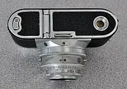 The lettered Vito camera models eschewed the folding mechanism in favor of a rigid, fixed lens, trading some portability for simplified operation. The earlier Vito B line (1954–58) uses a novel base plate design for film loading,[6] while the succeeding Vito C line (1959–68) uses a standard swing-open back. The B was equipped with one of two Color-Skopar 50 mm lenses (either f/2.8 or f/3.5) and the Pronto or Prontor SVS shutter had a minimum shutter speed of 1⁄200 or 1⁄300, respectively.[6][11] C models were equipped with Lanthar or Color-Skopar lenses (both 50 mm f/2.8); there are some variations in the color of the bezel around the meter, rangefinder, and viewfinder window.[12]