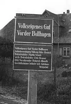 The Volkseigenes Gut (German for 'People-Owned Property' or 'Publicly Owned Estate'; abbreviated VEG) was a state-owned farm in the German Democratic Republic (GDR), corresponding to the Soviet Sovkhoz and the Państwowe Gospodarstwo Rolne in the People's Republic of Poland. In contrast to the Landwirtschaftliche Produktionsgenossenschaft (LPG) or collective farm, another form of state agricultural enterprise, the VEGs were often the successors to former private farms which resulted from the land reform in the Soviet sector of Germany mandated in the Potsdam Agreement of 1945.