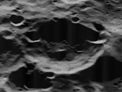 This crater has been heavily worn by subsequent impacts, leaving the rim and interior battered and cratered. There is a small crater attached to the exterior of the rim to the southeast, and the remains of a similar-sized crater along the southern edge. Small craterlets lie across the northwest, west, and southwestern rim edges. The remaining rim edge is rounded from impact erosion. A small craterlet lies almost at the crater midpoint.