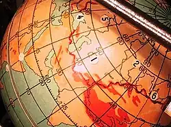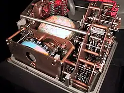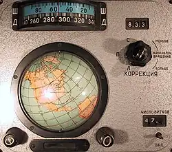 Globus IMP instruments were spacecraft navigation instruments used in Soviet and Russian crewed spacecraft. The IMP acronym stems from the Russian expression Indicator of position in flight, but the instrument is informally referred to as the Globus. It displays the nadir of the spacecraft on a rotating terrestrial globe. It functions as an onboard, autonomous indicator of the spacecraft's location relative to Earth coordinates.[1] An electro-mechanical device in the tradition of complex post-World War II clocks such as master clocks, the Globus IMP instrument incorporates hundreds of mechanical components common to horology. This instrument is a mechanical computer for navigation akin to the Norden bombsight. It mechanically computes complex functions and displays its output through mechanical displacements of the globe and other indicator components. It also modulates electric signals from other instruments.