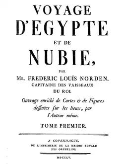 - 1779 – F.L. Norden, Beschreibung seiner Reise durch Egypten und Nubien, Johann Ernst Meyer, Leipzig and Breslau.