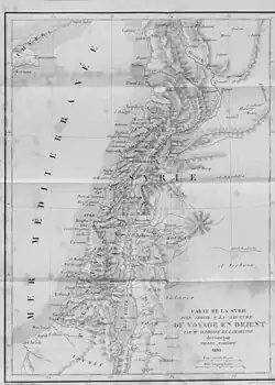 The first volume of Voyage en Orient reports Lamartine's travels through modern day Lebanon. His journey began on 11 July 1832 when he left Marseilles with his wife and daughter. They arrived in Beirut on 6 September of the same year. During this trip, Lamartine wrote extensively about his encounter with Lady Hester Stanhope and Bashir Shihab II.[1]