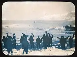 As his 27-man crew set up camp on the slowly moving ice, Shackleton's focus shifted to how best to save his party.[5] His first plan was to march across the ice to the nearest land, and try to reach a point that ships were known to visit.[6] The march began, but progress was hampered by the nature of the ice's surface, later described by Shackleton as "soft, much broken up, open leads intersecting the floes at all angles".[7]